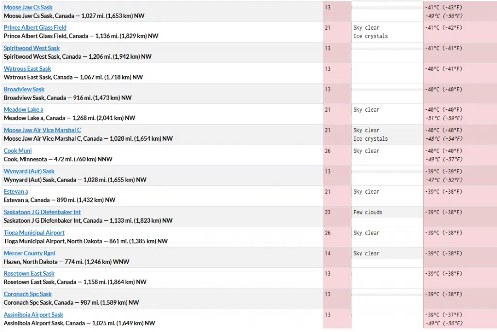 - Meadow Lake: -40°C (-40°F), feeling like -51°C (-59°F)